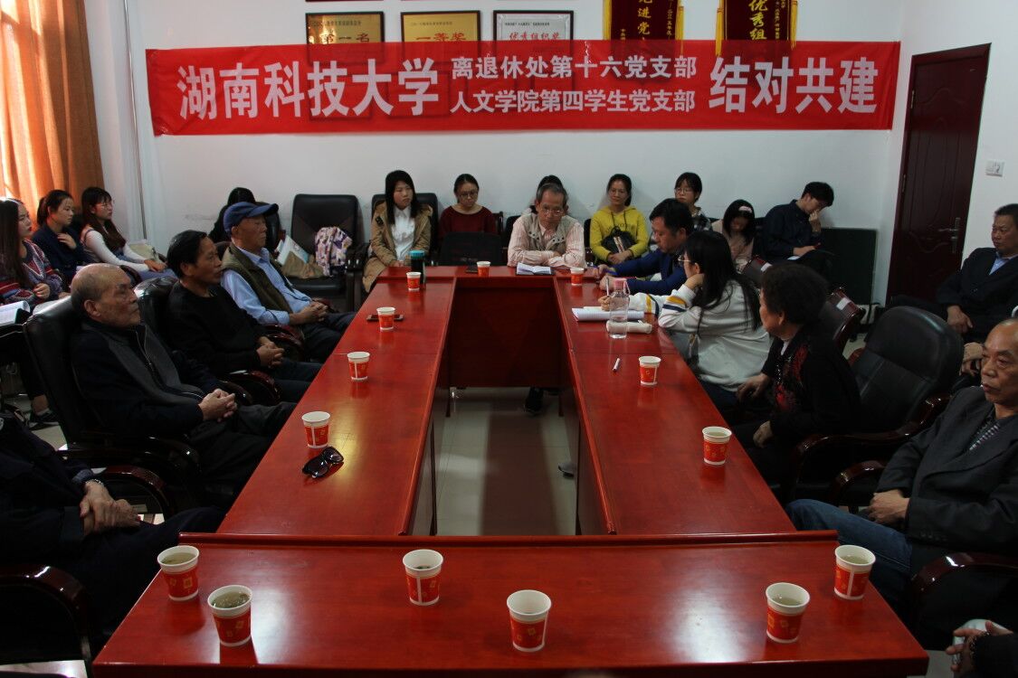 2018年10月30日,在立言楼410,乐鱼网页版在线登录离退休处第十六党支部与乐鱼网页版在线登录学生第四党支部“结对共建”活动顺利举行,会议由离退休处第十六党支部书记贺育秀主持,乐鱼网页版在线登录党委书记廖加林,副书记邓辉出席了此次会议。离退休处第十六党支部的17名老同志和乐鱼网页版在线登录学生第四党支部的16名党员参加了此次会议。