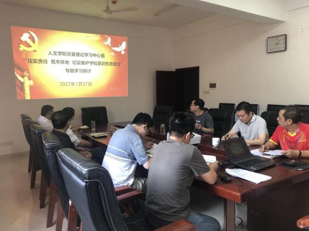 2022年7月27日,乐鱼网页版在线登录学院党委理论学习中心组在立言楼B505室开展“压实责任 筑牢阵地 切实维护学校意识形态安全”专题集中学习,集中学习由曾志东书记主持,全体党委委员和党政办负责同志参加了本次集中学习。
