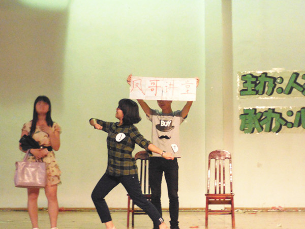 比赛班级依次按抽签顺序展开,预赛成绩第三名的文学四班带来第一个话剧表演-《I believe I can fly》,剧中主角徐文辉以滑稽的形象虏获观众的阵阵掌声,出演反派角色的他在各部门竞选碰壁后,唱出“I believe I can fly”,他说道“大学注定是一场孤独的旅程,就算屡次遭受挫败,也要活得漂亮。”