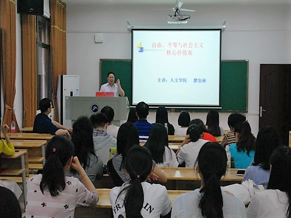 本次专家讲座分为两场,分别邀请乐鱼网页版在线登录党委书记廖加林教授和我校社科处副处长、乐鱼网页版在线登录李胜清教授作主题讲座。廖加林教授的讲座主题是《自由、平等与社会主义核心价值观》,廖教授在讲座中从“核心价值观”的定义谈起,从哲学社会科学的角度全面分析了社会主义核心价值观。他借用苏格拉底的名言“未经省察的人生是没有价值的”,鼓励、引导同学们要重视个人的三观,努力发掘自己在个人、社会、国家等三个层次的价值。