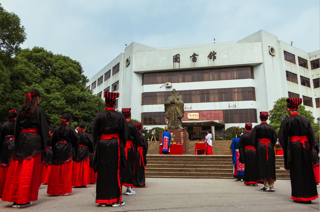 鼓声镗镗,琴声淙淙,舞袖翩翩,诵声朗朗。为弘扬传统文化,传承儒家思想精神,9月23上午,迎着微凉的晨风,由隐山哲学社主办,幽篁古琴社、古莲汉韵社协助办理的祭孔大典在北校图书馆前庄严开场。我院院长刘奇玉,历史系张晚林教授,思政系李育军教授,颜中军教授,朱学恩教授等领导老师到场,祭孔现场吸引了校内外观众前来观看。