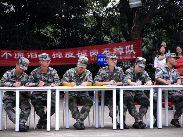 下午的训练于四点左右结束,全体新生由各排排长带领集结完毕,观看队列会操表演。队列会操评比开始之前,营长向全体新生申明现场纪律及评比规则等,要求全体新生在观看时注意纪律,不要讲话。本次队列会操评比的顺序依次为物电学院,教育学院,数学学院,法官学院,乐鱼网页版在线登录。评比内容为立正、稍息、跨立;停止间转法;蹲下、起立;敬礼、礼毕;齐步行进与立定;跑步行进与立定;正步行进与立定。在前四个学院依次表演完后。方阵队由教官带领,迈着齐整的步伐雄赳赳气昂昂走向训练场中央。在乐鱼网页版在线登录方阵队各流程的停顿中,场上不时响起掌声。五个学院的方阵队会操完毕后,营长即刻宣布了评比结果:“我宣布,本次队列会操评比,获得第一名的乐鱼网页版在线登录!”营长的话音一落,场下的乐鱼网页版在线登录全体新生便爆发出热烈的欢呼与掌声。随后,营长对各学院队列会操评比情况做了讲评。他指出各学院的方阵队分别存在哪些问题,其中,正步节奏过快、脚尖下压不够等是各学院都存在的问题,乐鱼网页版在线登录方阵队则存在报数时音量稍小,个别队员有小动作的问题,但整体精神面貌较好。评比结束后,乐鱼网页版在线登录院连长尹俊根据营长指示对方阵队会操做了简单的讲评:“大家虽然拿了第一,总体表现得很不错,但离标准还是有一定差距的,希望大家回去后把存在的问题都解决好。”
