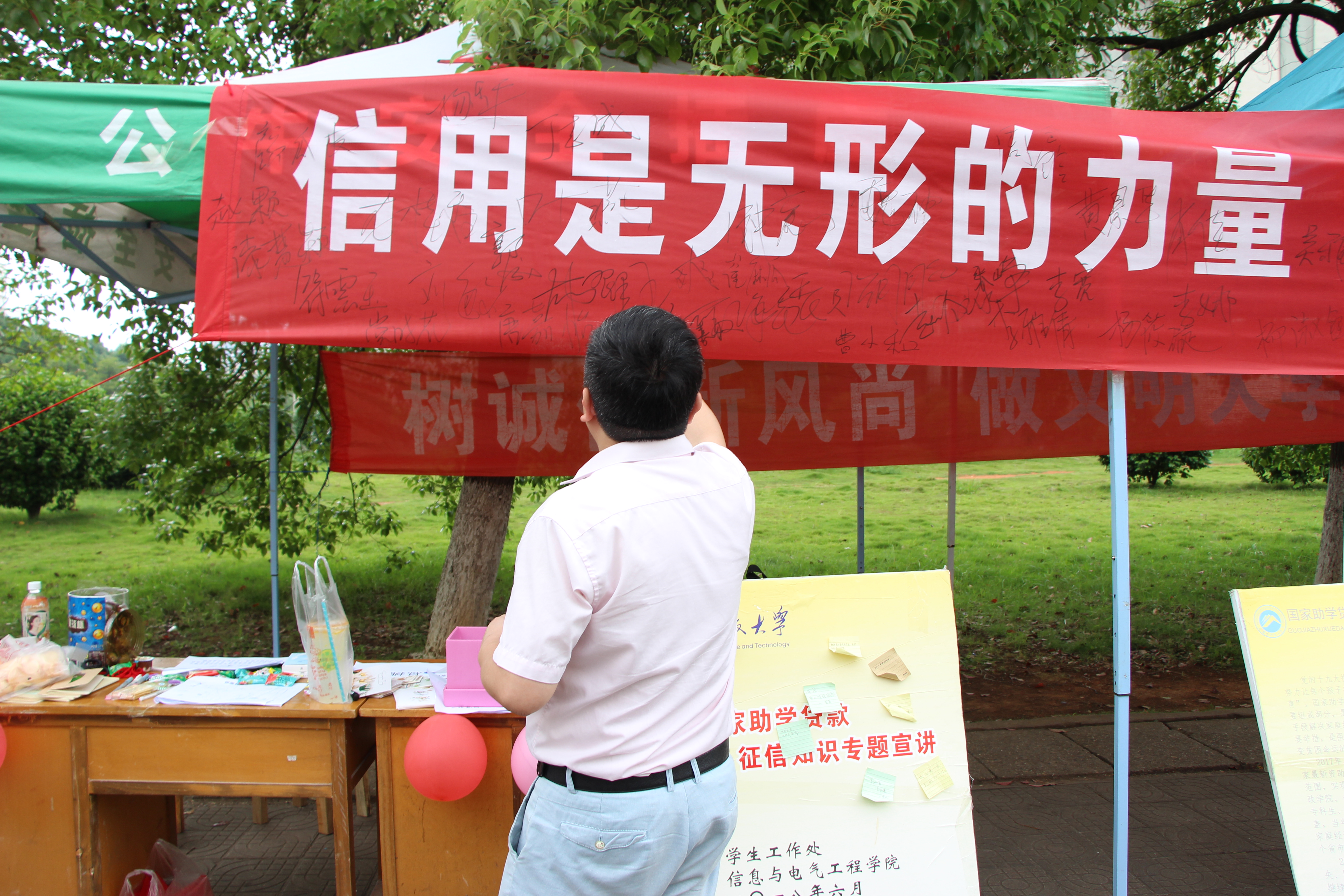 此次活动以“诚实,道德之基;守信,和谐之源”为主题,面向14级贷款学生,学院贫困生及其他大部分人员。活动寓教于乐,设置四个小游戏让同学们参与,并设有奖品,同时,向同学发放诚信读本,采访他们对诚信的认知与理解、实践状况,做好笔录,邀请他们在横幅上签字、写诚信三笔字。