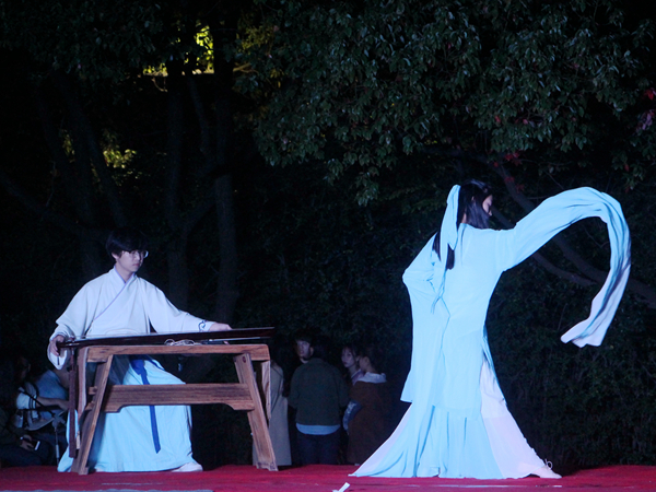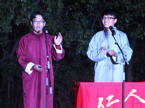 此次晚会主要表演者为我院各社团成员,团委学生会文艺部以及太音琴舍、舞奇迹舞蹈。晚会开始,音乐《Rumor》一经响起,即刻点燃了全场气氛,文艺部的热舞带动了全场观众的热情。在经久未息的掌声中,仁人乐曲艺社带来了太平歌词和相声《人在囧途》,一副快板在表演者刘明手中上下翻飞,让大家体会到了传统艺术的魅力。除了传统曲艺,汉舞《礼仪之邦》和古琴独奏《梅花三弄》更是为晚会增添了不少典雅韵味。由星野书画社、古莲汉韵社联合献上的现场书法融合了古琴、书法、水袖舞,为观众带来了一场视听盛宴。军训慰问演出,自然少不了阳刚之气,在激动人心的背景音乐中,军事爱好者协会带来的格斗表演令人热血沸腾,将全场气氛推到了最高潮。