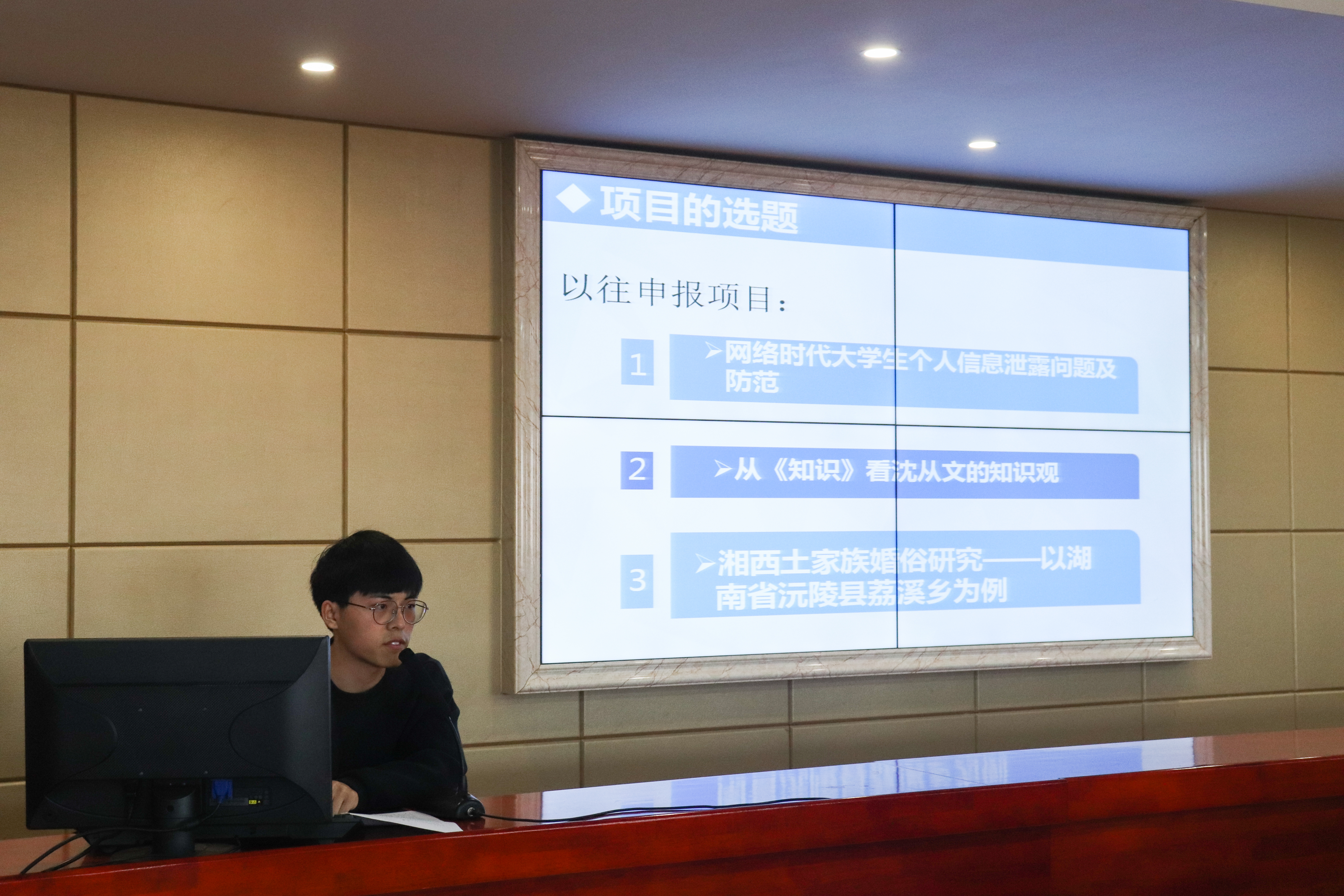 之后,刘忠存、梅洁、孙亚帆、刘建敏、陈亮帆、刘一博同学则以自身的实际情况为依据,向同学们介绍了在参与SRIP项目的过程中应当注意的几点要求。首先,在申报书的填写方面,刘忠存为同学们做了详细介绍,他指出,研究摘要要重点突出、详略得当,研究计划要目标明确、内容可行,立项依据要意义具体、前景广阔。在指导老师选择方面,他也给了同学一些提示和启发。接着,梅洁以自己的两个项目《自我表达vs舆论表达:“95”后大学生使用网络流行语进行表达的实证研究》以及《新媒体语境下大学生对“佛系”观念的认知及其影响研究》为例,详细为大家介绍了SRIP项目的前期准备、研究过程、后期答辩的具体要求。而在项目的具体实施阶段,孙亚帆、刘建敏、陈亮帆则讲述了自己在研究中遇到的情况,介绍了项目具体实施时需要运用的研究方法以及可能会遇到的问题。在项目后期答辩方面,陈亮帆、刘一博同学为我们做了大致的介绍。她们都共同提到,在选题方面,应当注意与自己专业的匹配性,要着重关注所选课题的创新性、可行性、实用性。