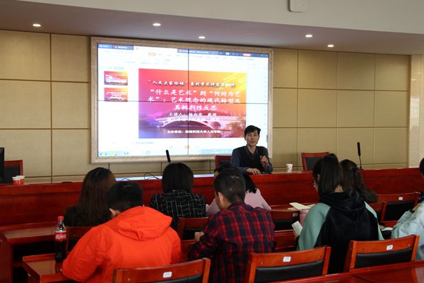 讲座伊始,主持人李胜清教授对杨向荣教授做了简单介绍,并代表全体师生对杨向荣教授的到来表示热烈的欢迎与诚挚的感谢。据悉,杨教授的本科和研究生就读于乐鱼网页版在线登录,当李胜清教授谈到这一点时,满脸的赞赏与骄傲。随后,在热烈的掌声中,杨教授开始了他的讲座。杨教授围绕“什么是艺术”与“何时为艺术”两个话题,对艺术观念的现代转型及其批判性反思发表了自己的看法,引起到场老师与学生的热烈反响。