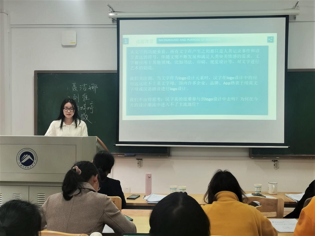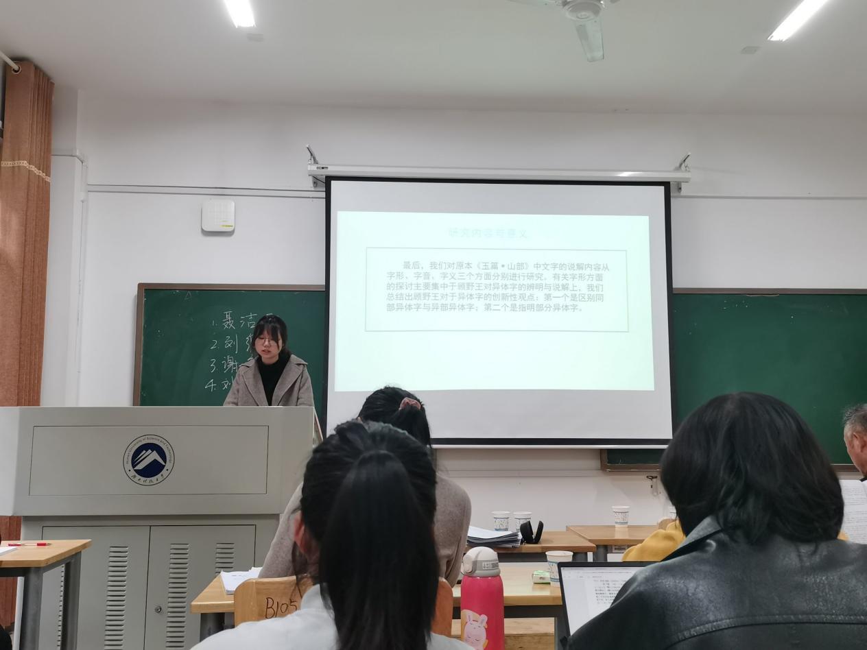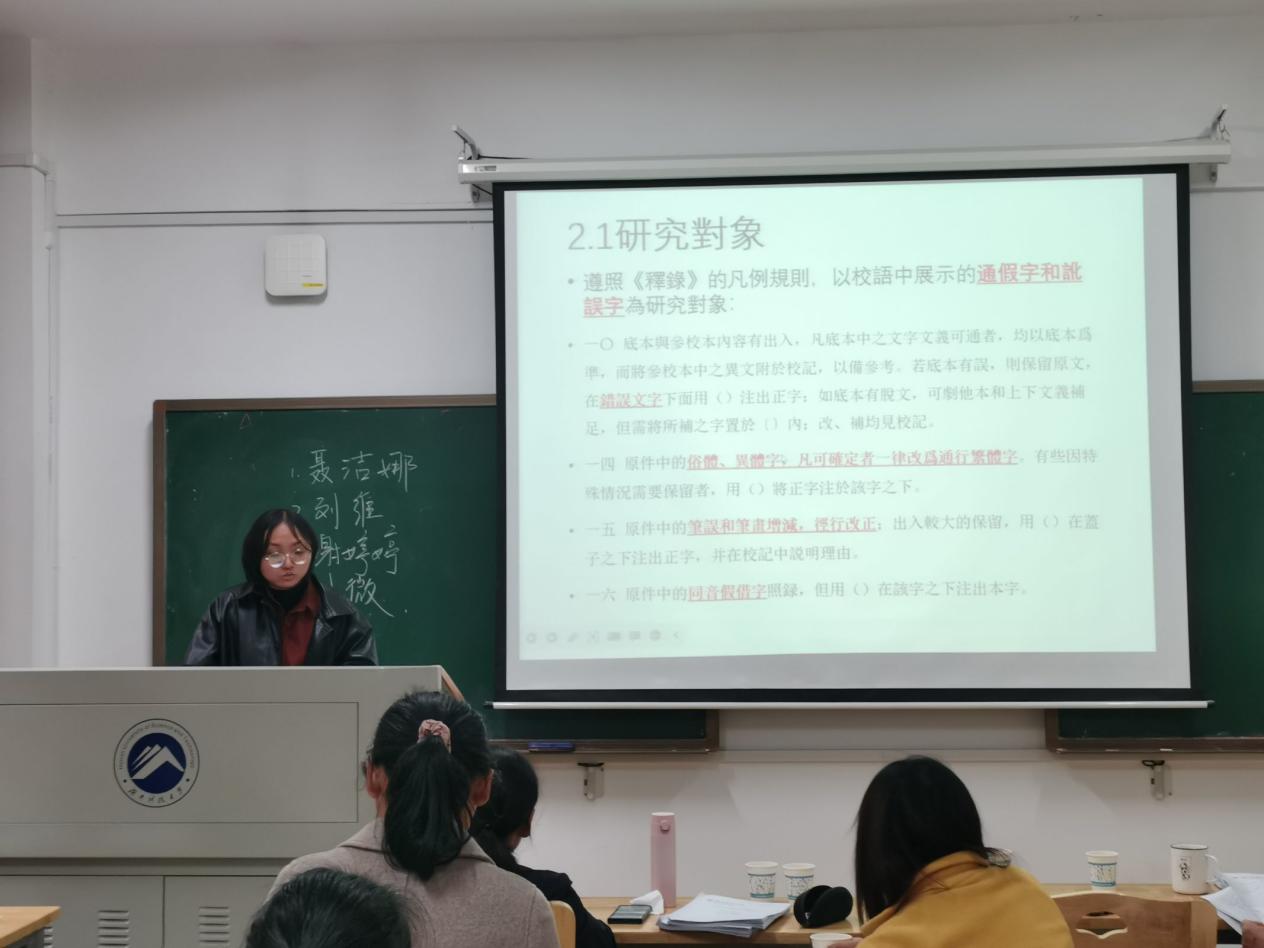 预答辩伊始,聂志军教授说明流程,并敦促同学们趁热打铁,在会后尽快与各自导师沟通并完成终稿。聂洁娜、刘维、谢婷婷、刘微四名报告人向各位老师汇报了毕业论文情况。他们的论文题目分别为“《肩水金关汉简(壹—伍)》字词关系研究”“基于文字视觉设计需求的汉英文字比较研究”“原本《玉篇·山部》研究”和“《英藏敦煌社会历史文献释录》校语用字研究”。