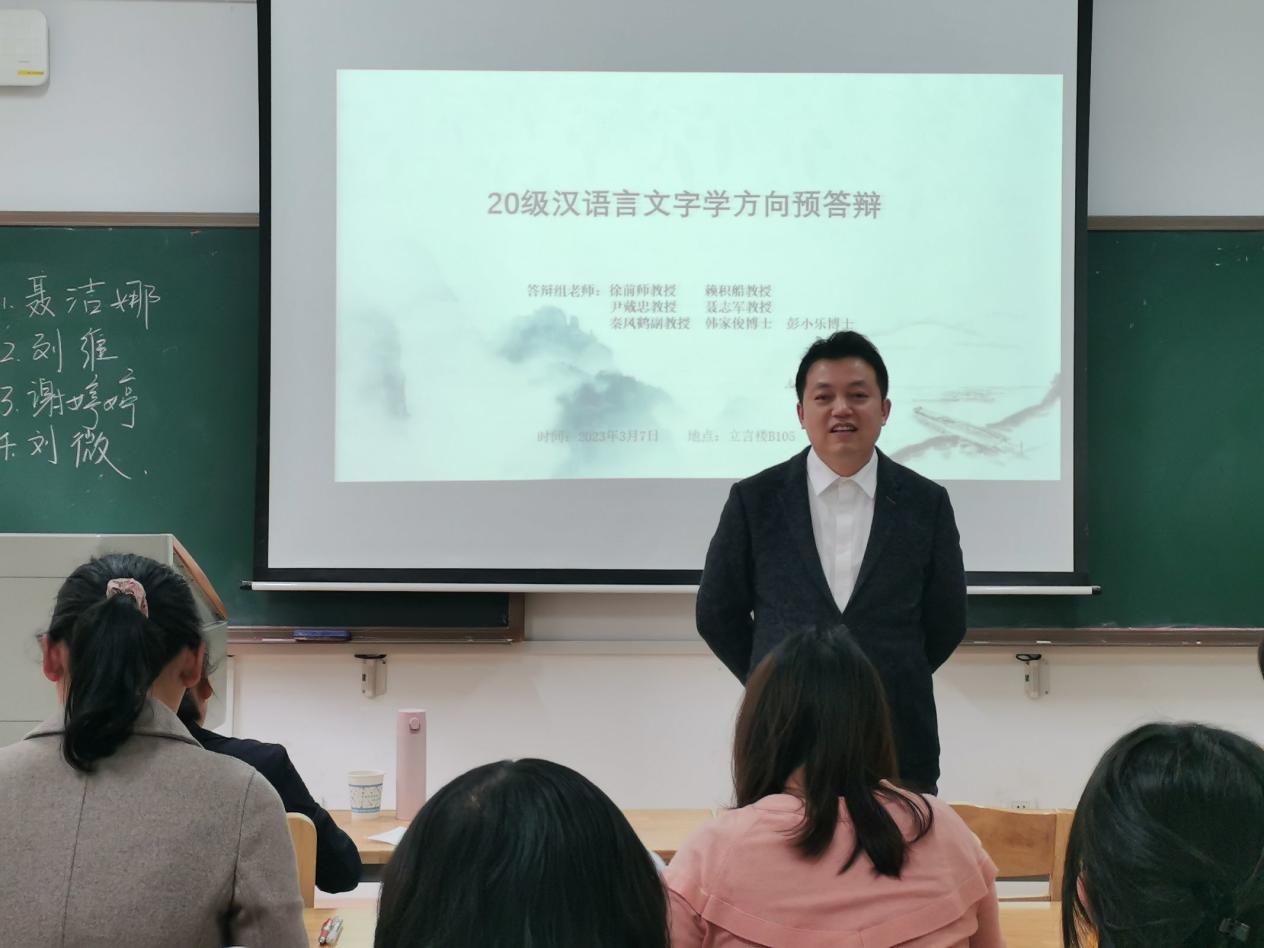 3月7日14:30,我院20级汉语言文字学方向研究生毕业论文预答辩于立言楼B105举行。此次预答辩由聂志军教授主持,徐前师教授、赖积船教授、尹戴忠教授、秦凤鹤副教授、韩家俊博士、彭小乐博士担任点评教师,21级汉语言文字学方向研究生到场旁听。